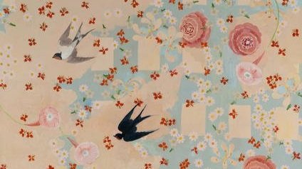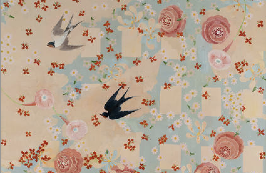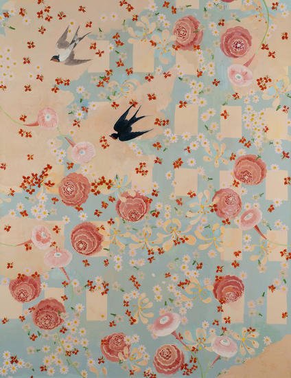 My big flower paintings are like gardens. They evolve over months, sometimes years, and along the way, they develop minds of their own. I compose the elements initially, but at a certain point in the process, things become a little looser, or at least more democratic. As these same elements command an organization more naturally suited to them, I am forced to answer in ways that are often unexpected. By contrast, each of my small flower paintings and still lifes is deliberate. I establish the composition at the outset, and it rarely veers. But, here, like fugitive guests, the birds—if they appear at all—are unplanned. They enter later and perch if they fit. I experience my work as a threshold between the past and present. At one level, as I finish a piece, it is a record of my past action. At another, the subjects I depict, the birds, flowers, trees, and patterns, are of personal and emotional significance, or records of a different sort. The dishes and linens that inspire me were my grandmother’s; the flowers are from my garden and the books in my library; and the patterned scrims evoke the wallpaper and fabrics that surround me. My paintings, like an old house, contain many levels of memories. They are a source of constancy, and yet the gentle upheavals make them what they are.