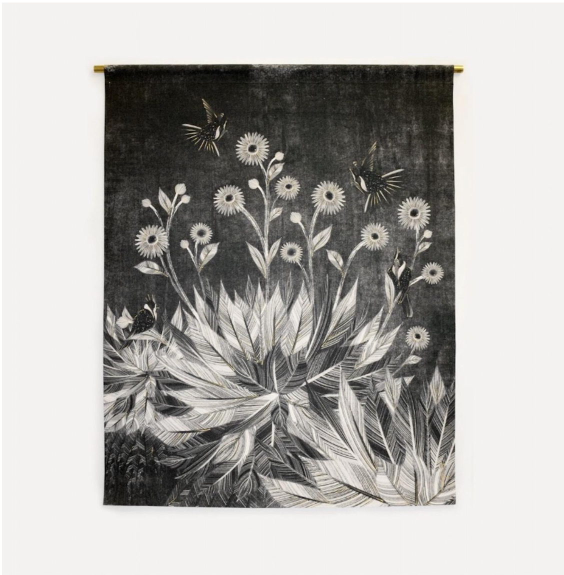 Back in the studio, I use a variety of digital and analog approaches, including drawing, frottage, monoprints, photocopying, and digital painting to create collaged forest portraits, often at a large scale. These texturally detailed and immersive compositions aim to draw the viewer into contemplation with the immense knowledge and web of relationships that the forest holds. I employ a monochrome palette as a metaphor for the endangered natural world. Gold is used for details, acting as glimmering reminders of human avarice and the violent costs of extractive economies.