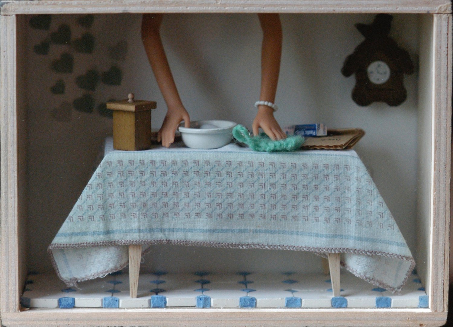 Is home a pile of beautiful and methodically organized linens like the memories of her childhood or is it a womb of soft wool hiding sharp needles nestled in a broken glass? Does it have five sides like her little boxes? Is it the home of the goddess, mother of all? How does she worship her in order to belong? Can she bring her to life by painting her veins? Will she accept her if she builds her an altar? Is it home if there is a family inside? If she knits their portrait and they all look alike does she belong to this family? Where is the entrance? Is the door shaped like a vulva?