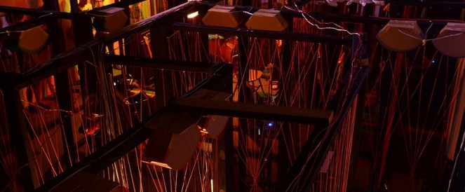 Terror-ushers greet attendees with a shamanistic cleansing ritual as they enter Apparition, the duo Trouble’s group of overlapping environments of light, sound, and performance. Sprey: A Narrow Vehicle dramatizes this moment of entry using light, wind, moisture, leaves, and smoke, conveying the audience to roaming musical performances by special guest performers TBA. Just beyond that, Dial, a sculptural projection screen, features live video projections and a 24-hour sound track. It references the tradition of the singing of organum in correspondence to the different moments of the monastic day.