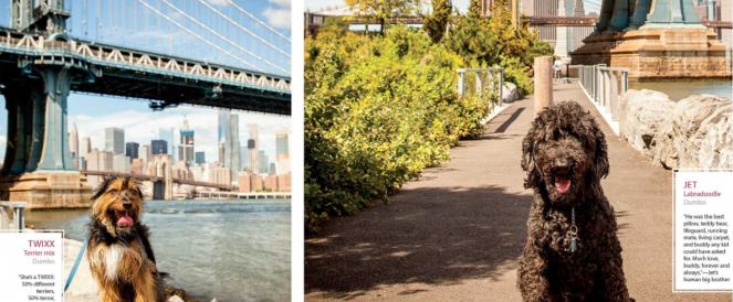 Each dog is presented in one or more photographic portraits, with name, breed, and occasional comments from the dog’s human companion.