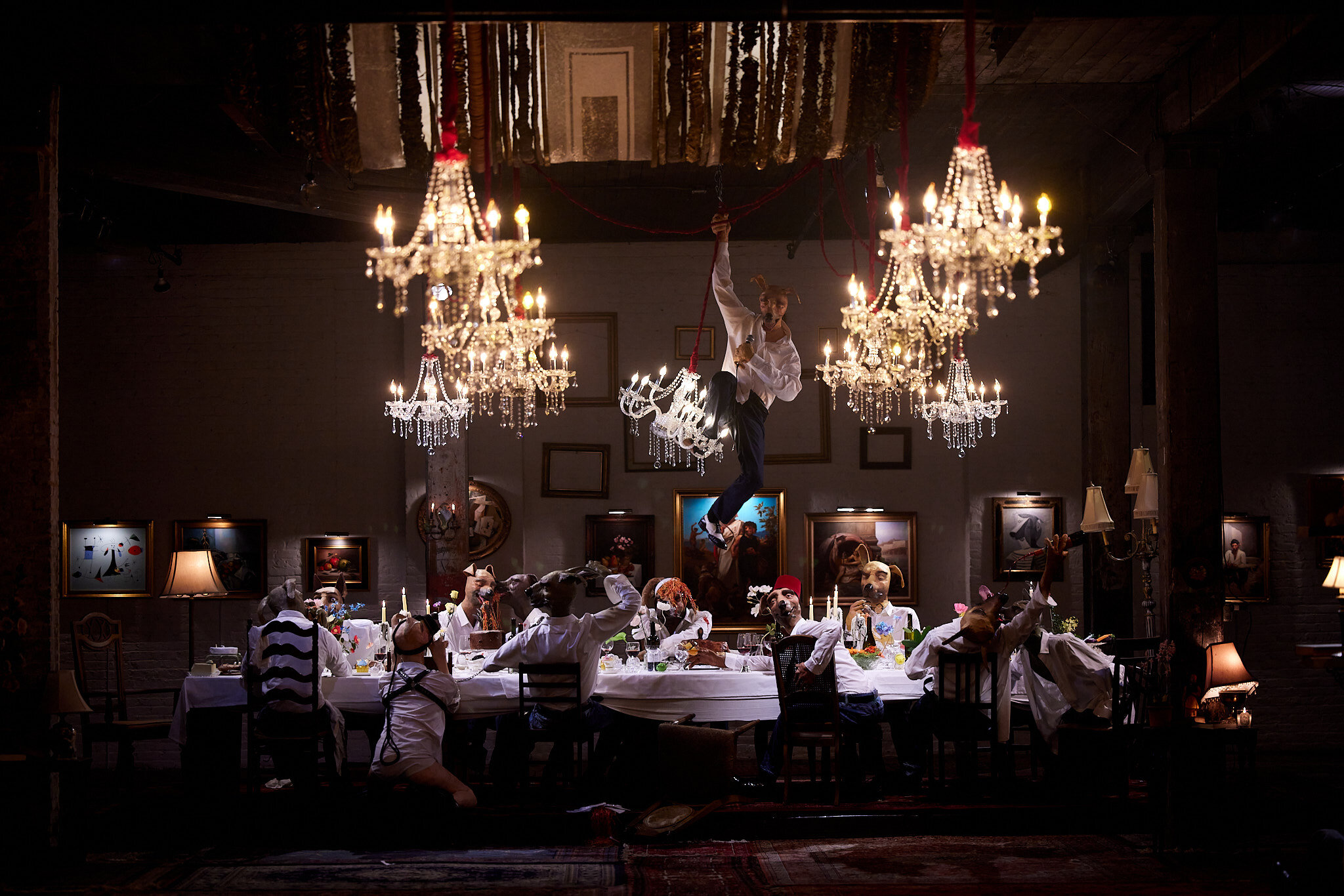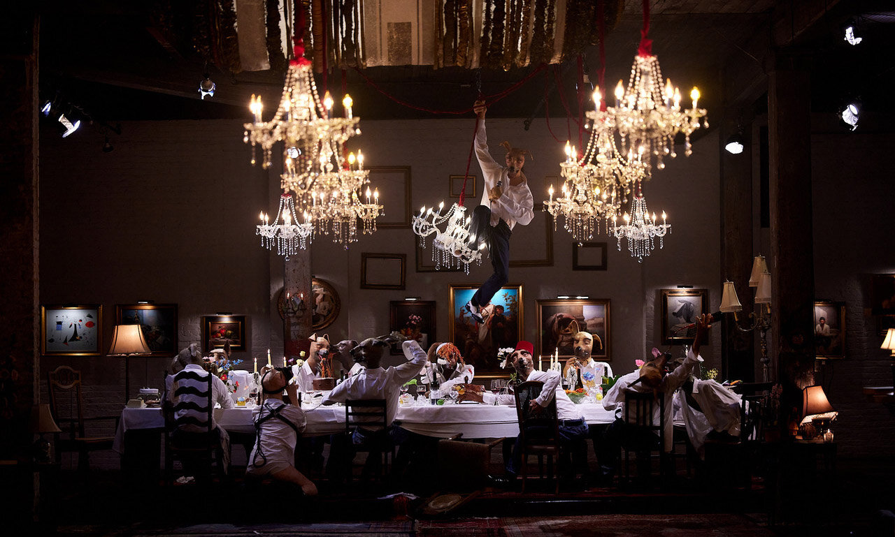 Dog Show #1: The Dinner Party features 16 life-sized humanoid dogs that revel, sleep, and misbehave at an elegant yet excessive feast reminiscent of the notorious gatherings that Morrison and his partner have historically been known to throw. Made of clay and plaster, each guest is a variation of the same character, all wearing white button-down shirts, indigo jeans, and looks of a desperate search for pleasure. Special editions of his extremely successful paintings and food sculptures have been seamlessly integrated into the immersive environment. Never has it been truer that people have an unexpressed animal side, desperate for release. We’ve been confined for too long.