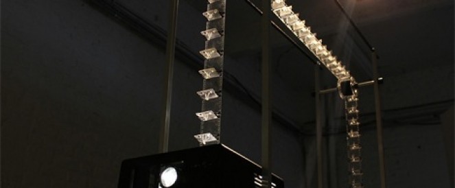 Media Archaeology is a new science. It’s not studying the history of cinematograph and gramophone, but how our perception of the world is transformed through the camera lens and the speaker. The audiovisual is like a soundtrack, a visual tracking shot moving in parallel to us; pictures and sound are visual fictions that moved away from reality, but disrupt and influence our relation to reality. For this unique variation on 3D-cinema, Julien Maire made his images using a 3D-printer. Like so many prototypes from early cinema, the piece consists of just a short loop. This stereolithographic projector offers a conceptual game around 3D-cinema, what the French used to call ‘relief cinema’ (as in ‘bas-relief’).
