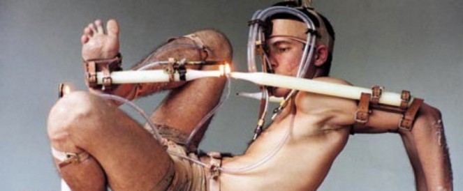 A performance in which candles are attached to Michel Groisman’s body made possible by a series of leather straps and tubing. In one continuous action, candles are lit and extinguished in a constant ritual of fire and breath.