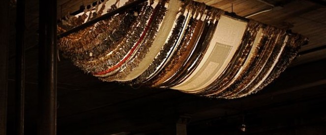 Steven and William Ladd, two artists residing in Brooklyn, NY, were invited by The Invisible Dog to create a chandelier for the art space. Upon visiting the art space, the artists were immediately drawn to the basement, where they found buckets piled high with old belt buckles and industrial parts. Sifting through the treasure-filled buckets was right up their alley. For years, they have been getting their hands dirty while cleaning, purifying and transforming objects into beautiful structures. The massive chandelier they designed and created combined elements of the found buckles with intricate hand-loomed, glass-beaded textiles.